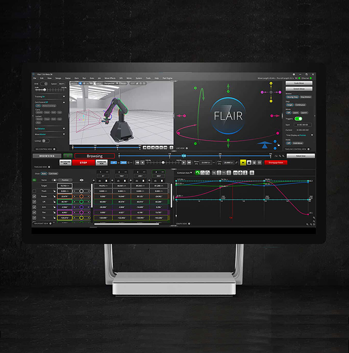 Our rigs are programmed using Flair Motion Control software, the most advanced motion control software available. Moves can be planned in 3D packages, fed into Flair and executed by our rigs. Reversely, moves programmed in Flair can be exported to 3D packages. For following live action or adding a handheld feel we have handweels and pan bars (encoded Fluid head) as well as options for manual focus/zoom record and playback.